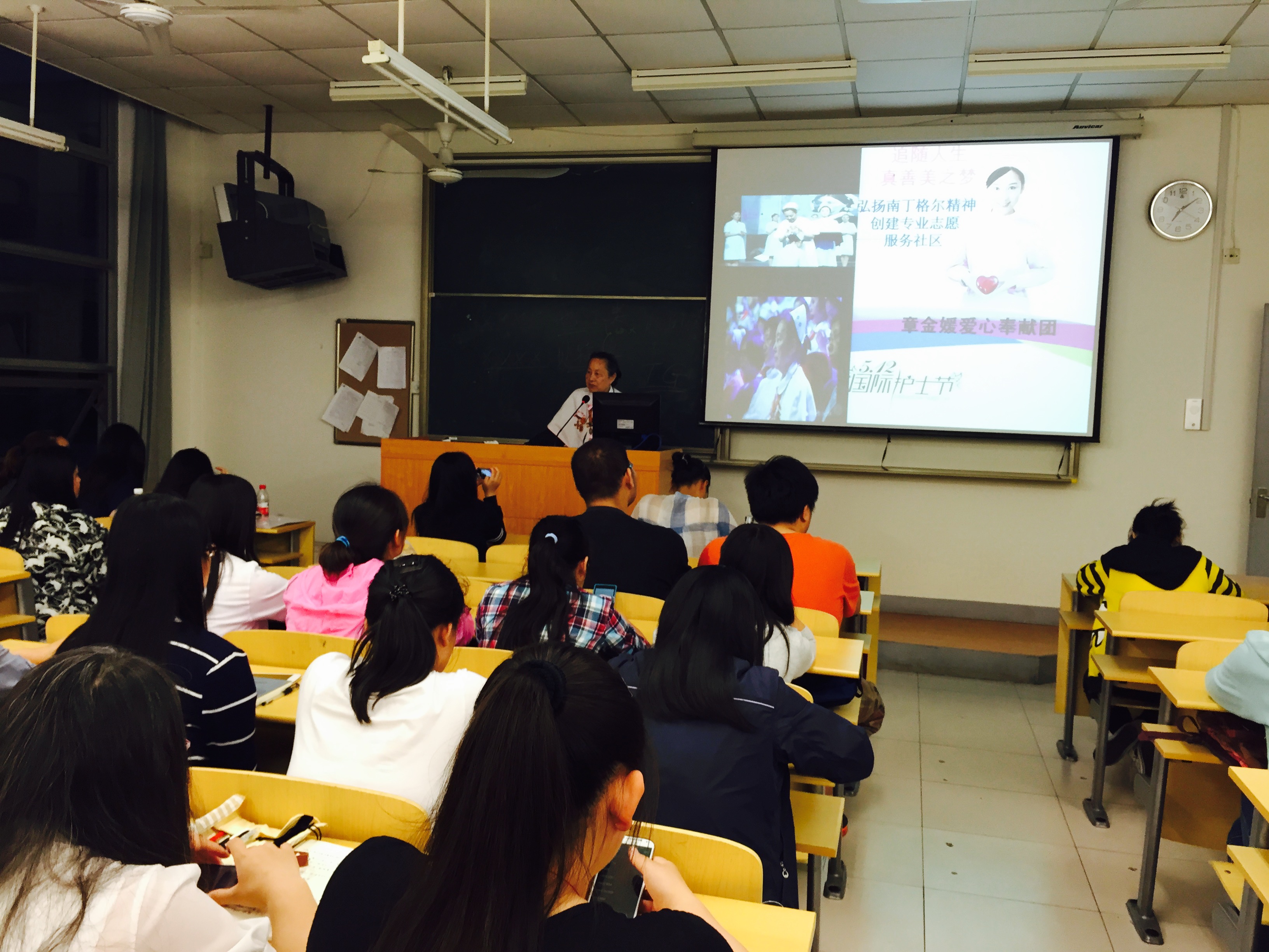 2015年5月20日晚七点,由共青团上海中医大学委员会主办,共青团taptap点点官方网站委员会承办的“追随人生真善美之梦”taptap点点官方网站远志大讲堂于教学楼7302室顺利展开。本次主讲人为中国南丁格尔志愿护理总队的创建者章金媛老师,曾荣获第39届 “国际南丁格尔奖章”、中华首届慈善奖、中国60华诞贡献奖等重大奖项和全国三八红旗手标兵、中国最美女性等荣誉称号,本次讲堂吸引了许多来自护理系的老师和学生。