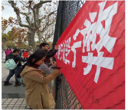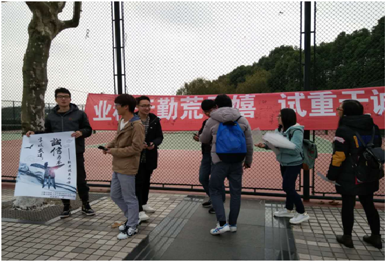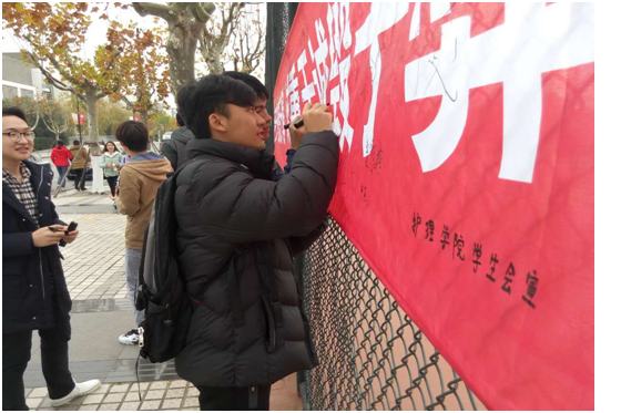 或是对自己本月拼命备考的诚信之果的期待,或是对自己人品与尊严的证明,或是对考试公平公正的认可,又或是为自己接下来的奋斗加油打气,大家都踊跃参与活动,在横幅上留下了自己的笔迹和名字。看着这些有力的字迹,真想为同学们竖起大拇指。