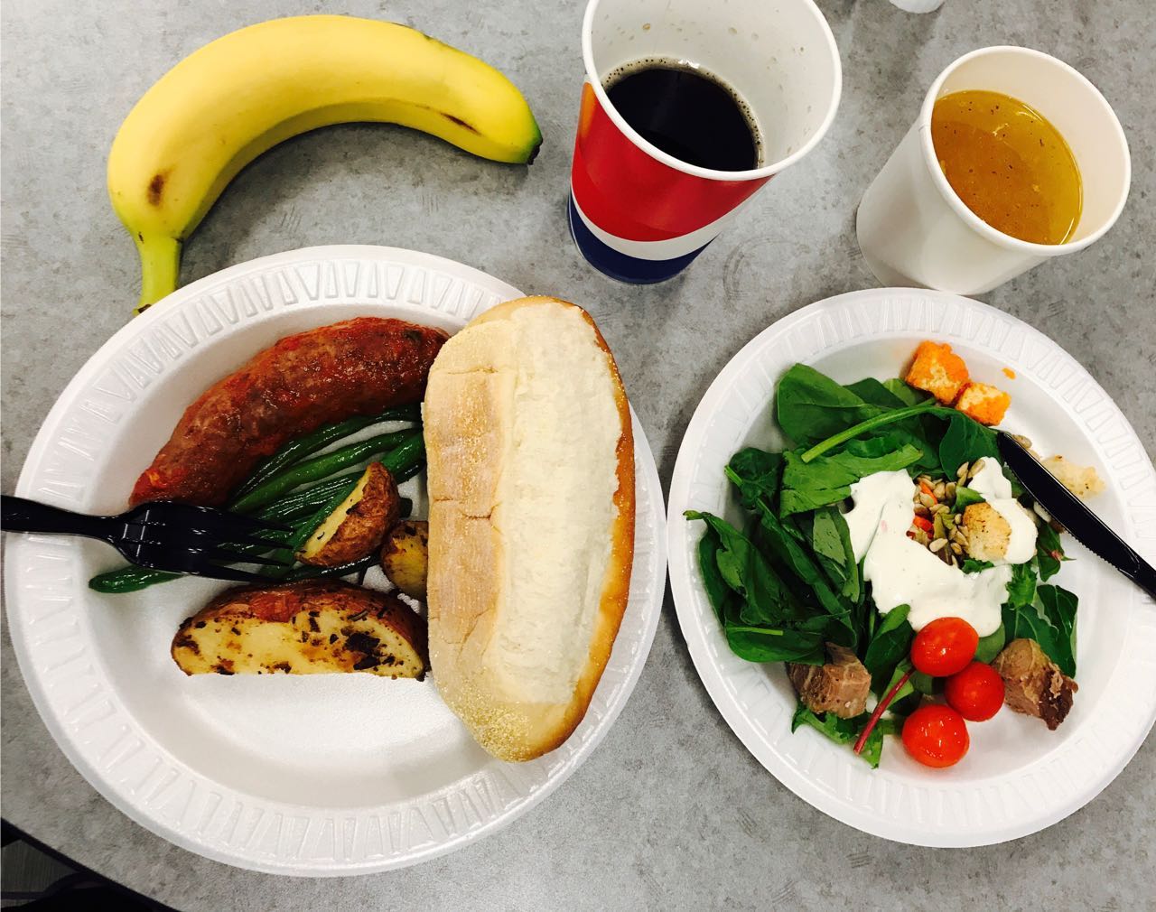 既然聊到了吃,不妨说说我们在美了解到的美式饮食吧。美式餐点一向以轻便快捷为主,早餐常见的有三明治、烤面包、华夫饼,再配上鸡蛋、咖啡或者牛奶泡上各类麦片也是不错的选择。而午饭通常因为时间较少,也是简便为主,这就是为什么汉堡包、热狗流行的一大原因了,不仅方便还管饱啊!此外披萨也是午餐常看到的身影。美国人吃饭讲究食物的营养价值,喜欢保留材料的原本味道,所以这里不得不提的是生菜沙拉,除了在校园里,美国上班族中也很是流行。美国人大多喜欢吃生的菜,即使是鱼肉类等肉制品也通常会煮半生半熟,肉中常常还带有血丝。在做饭这件事上,美国人追求简单快捷,不会耗费太长时间,这大概和他们认为煮太熟会削减食物的营养成分有关。在中国,则喜欢吃熟食,普遍不会接受半生半熟的肉食。美国人的晚餐是一天中最为丰盛的,称为正餐,一般会先上一道美味的浓汤,主菜常见的有炸虾、炸鸡、烤牛羊排、海鲜鱼类等,另外还会有蔬菜、面条、面包等。美国人喜欢在饭后吃甜点,比如蛋糕、冰激凌等,最后再灌一杯咖啡作为结束。