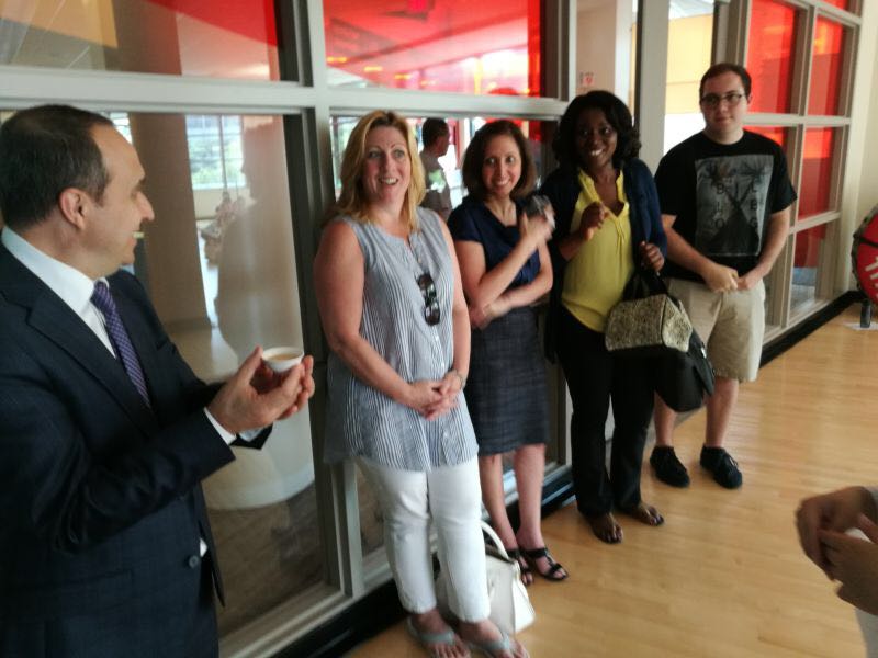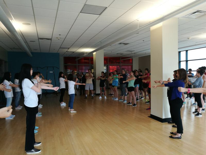 717日下午两点半,我们与美国的学生以及院内领导进行了中美文化交流,期间欢声笑语、欢乐融融。第一个项目是同学们依据学校武术比赛中的手指操改编的一小段团体操练,当主持人问美方同学有无兴趣一同练习时,美国同学纷纷举手,十分热情地加入了我们的团体手指操。院方老师跟着我们一起做,作为中美双方文化交流的开场,集体手指操快速将交流气氛调动起来,也拉开此次中国传统文化展示的序幕。