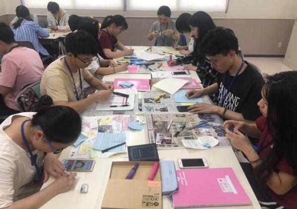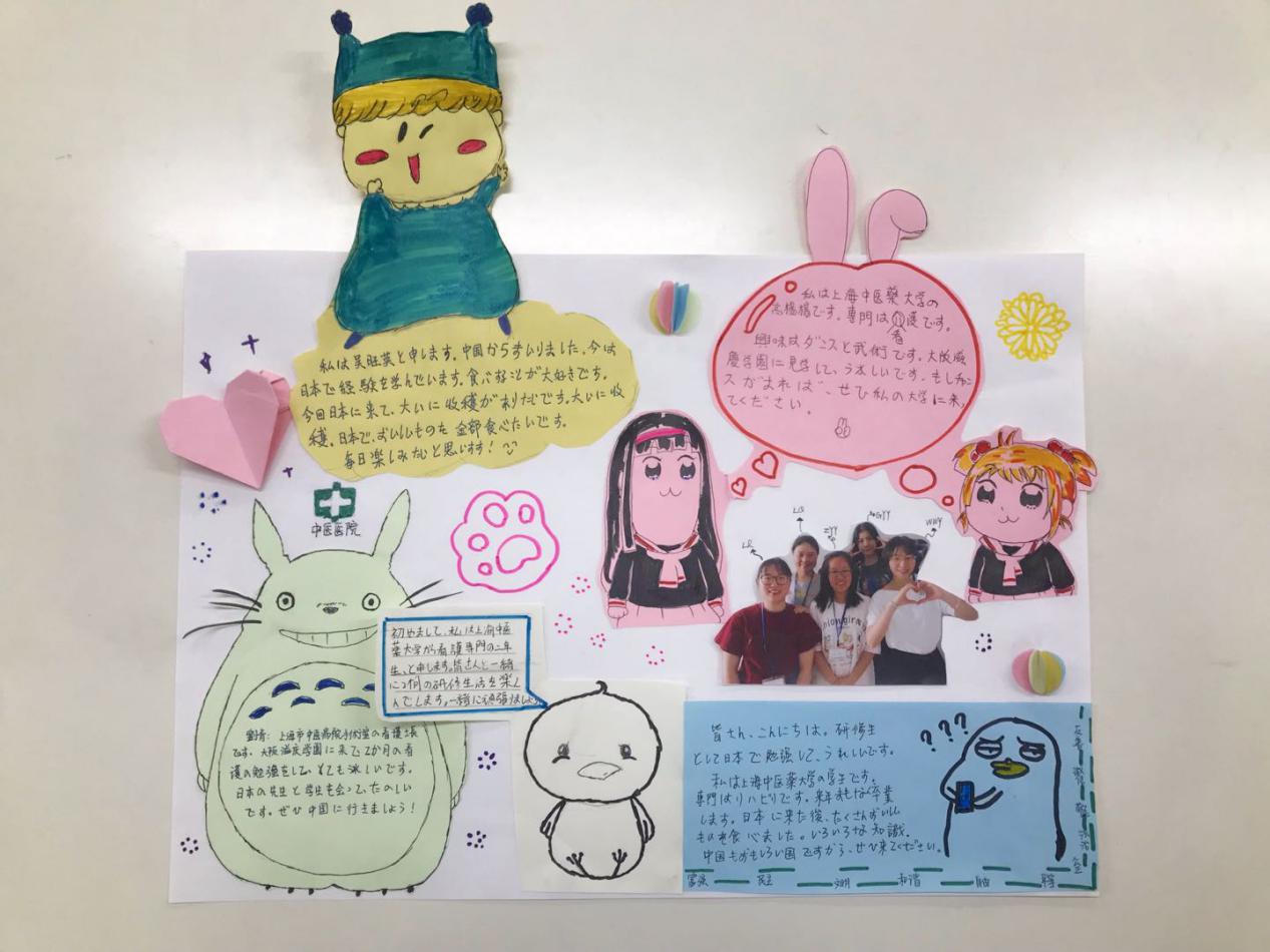 学习日语的第二周,课堂上一片热闹,虽然大家都没有系统学习过日语,但每个人都在努力地表达自己和学习新的语言。其中最深刻的应该是这堂制作自我介绍的海报,每一位同学都各显才能,绘画、书法、动漫元素,在每一幅海报中体现的淋漓尽致,我们用仅有的日语单词、用最简明的方式表达自己,一副作品完成,我们却无法言语那份激动和喜悦。日本老师把它们挂在了学院一楼的展示墙上,让过往的学生都能了解我们,了解中国。
