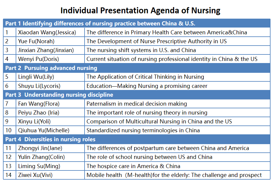 演讲的主题都是大家从lectures中获得的启示最后确定的,在耿朝辉老师的帮助下,大家对自己的presentation进行修改完善,最终分为4个模块进行介绍,分别是辨析中美护理实践的差异、探索高级护理实践、加强护理学科属性认知及护理的角色多样性。自2011年护理学从临床医学二级学科中分化出来,成为一级学科,护理学迎来全新的发展机遇,但在高等教育及高级护理实践人才队伍建设方面仍与国外有着一定差距,近一个月以来,通过对美国乃至全球医疗护理健康领域多场讲座让大家对护理专业又有了新的看法,对护理学科发展的方向有了崭新认识,同时,在更为广阔的视角下去看待未来自己从事的职业,也有了不一样的感受。下周大家将开启访学新篇章——医院见习(Hospital Shadowing),相信通过临床实际体验学习,每位成员都将会有新的收获。