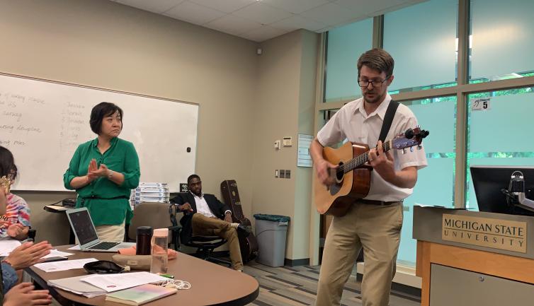顺利完成了presentation之后,就到了与英语老师Professor Kaufmann告别的时间。虽然只有短短四周的相处时间,但这段难忘的经历都让大家感到十分的不舍。临别之际,Professor Kaufmann 拿出吉他弹唱了一首<Goodbye My Friends>这首歌是他在我们这样的年纪,去西欧做交换生结束时写下的“Goodbye my friends,I won’t see you again for so long ...... so long ”,在轻慢的歌声与吉他声中,带着令人落泪的重量,我们在心中悄悄留下挥别之情,再见了老师,友谊长存。