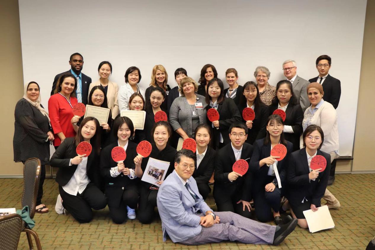 周四,我们在University Club举行了结业晚宴,大家分为三组分享了自己在医院的所见所闻,同学们的演讲涉及到了人文关怀、隐私保护、临终关怀、护理职业多样性等各个主题。用餐后,医院教育部门的老师为大家颁发结业证书,最后大家互相交换礼物并合影留念。导管室(Cath Lab)的主管Kim送给我们每人一个带有科室所有工作人员签名的乒乓球拍。虽然见习只有短短的三周,但是同学们在此过程中对护理都有了新的认识,对自己未来的护理道路有了更多的思考。