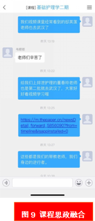 非常时期,引导学生在“战疫”中成长,战疫事迹就是最好的思政教育素材,本课程两位临床兼职教师赴湖北一线支援,课程中将其参与抗疫的感人事迹介绍给学生(图9),在感受老师的职业责任感的同时,激发学生的自身责任感与使命感,树立治病救人的决心。