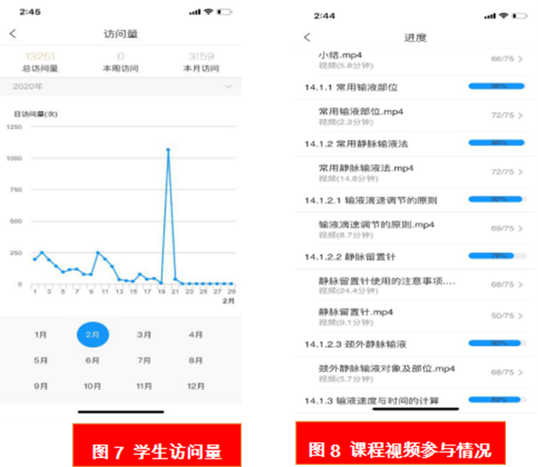 在学习任务中加入了主题讨论(图3-6),提高学生对重点知识的掌握,提高学生的课程学习粘合度和参与度。学生学习行为活跃,课程视频点击率高(图7-8),教学运行整体平稳,学生参与度高,作业完成率高。