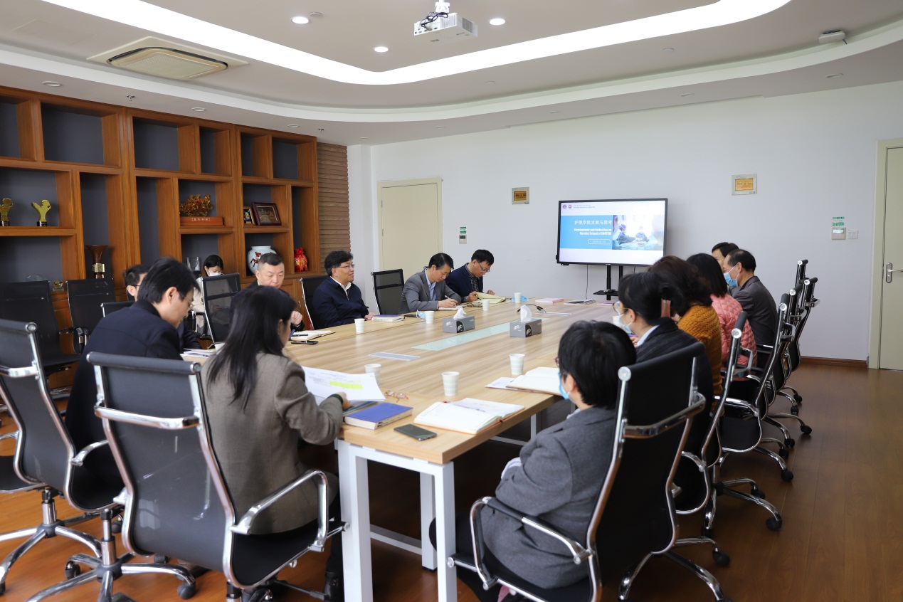张翠娣院长代表学院领导班子围绕学科建设和师资队伍建设调研主题,从学院发展现状、所面临困境以及未来发展等方面做了专题汇报。学院教师代表亦从护理学科发展、师资队伍建设等方面提出思考与建议。许铁峰副书记强调,要充分利用医院护理资源,搭好平台;要善于在学科交叉中寻找护理学科的发展方向,找准问题,重点研究。胡鸿毅指出,护理专业学生在社会上认可度高,可强化宣传,并落实落细应用型人才培养;杨永清提出,学院要更加重视高级别课题申报,高水平论文发表,提升学术内涵;要把已有的工作总结凝练好,积极申报科技进步奖。相关职能部门领导针对学院的发展及存在的问题提出了许多指导意见和对策,并表示一如既往支持学院各项工作的开展。