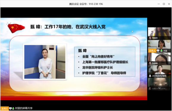 在此次疫情期间,上中医taptap点点官方网站有60多名校友支援湖北前线,不畏艰险、不顾生命,其中一位就是龙华医院呼吸科护士长、taptap点点官方网站“丁香花”导师团导师甄暐。作为上海第一批援鄂医疗队护理组组长,工作17年的她巾帼不让须眉,凭借一腔热血及多年的工作经验,勇敢地冲锋在抗疫一线。在本次党日活动中,通过观看甄暐同志在武汉抗疫期间拍摄的实地教学视频,同学们看到了医务工作者英勇奋战、 冲锋逆行在疫情防控最前线,用行动诠释了白衣天使救死扶伤的崇高精神,使大家更加进一步认识到作为一名共产党员的担当和使命,着力强化了学生党员们“不忘初心、牢记使命”的责任担当精神。