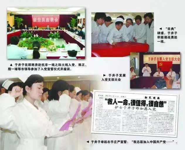 2003年,在抗击非典的斗争中,当时的于井子还不是共产党员,但她却积极请战,挺身而出,第一个报名,签下“生死状”,坚决要求到“非典”定点医院工作。当定点医院进入常态管理后,于井子又到发热门诊工作了整整3个月,她的优异表现和无私无畏的精神赢得了大家的肯定与尊敬。同年5月12日国际护士节,于井子参加了火线入党仪式,光荣地加入了中国共产党。