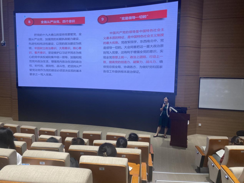 党校徐琳老师给同学们作了《学习党章,做合格党员》的分享,她强调每个党员都必须树立党章意识,党章是中国共产党人的必读书,希望同学们能掌握党章的主要精神、新党章修改背景、内容及主要条文,以党章为镜加强党性修养。最后,老师引用习近平总书记的话“一切向前走,都不能忘记走过的路”寄语同学们,希望大家“不忘初心,方得始终”。