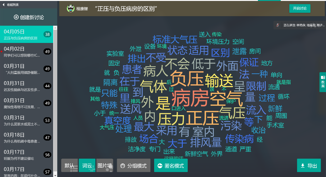 首先,陆海英老师发起在线课程中如何提高师生之间互动交流的话题,随后各位教研室老师交流分享了自身授课经验。如外科护理学采用分值驱动,通过将学生讨论的次数计入平时成绩的方式,有效提高学生发言的积极性;高级护理实践中采取了编号点答的方式,确保每位同学都能积极参与讨论。单亚维老师采用病人家属参与在线互动的形式,介绍患病后的求医心路历程,让学生有直观情感体验。程康耀老师介绍了在老年护理学中使用微助教公众号发起线上讨论,将学生讨论内容以观点墙的形式展现,从中可以摘取重要观点,大大提高了学生的在线互动和学习兴趣,激起了参会老师很高的学习兴趣。