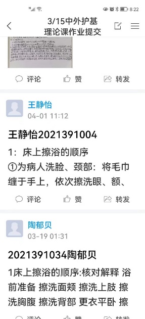 为适应线上学习的特点,提升学习效果,张锦玉和吴彩琴老师在《护理学基础》授课过程增加了较多互动的环节,并通过学习通系统定时发放随堂作业和课前测。对于无菌、口腔护理和静脉输液等操作课,主要采取看录像,课下总结操作流程并上传在线课程平台,由带教老师进行线上批改和即时答疑的形式开展。针对其中的标本采集等操作,鼓励同学们利用现有的抗原自测工具,进行“鼻试子标本采集”或其他课程相关内容的健康教育和科普视频制作和拍摄,以丰富学生的学习内容,实现护理健康技能应用于实践并传播的目的。