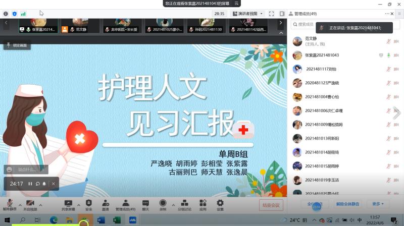 范文静老师介绍了《护理人文修养与沟通技术》课程线上见习过程。见习涉及医院文化、护理服务明星的成长之路与经验分享及临床沟通实践三部分,临床老师采用视频介绍和讲解的方式进行线上授课,将护理人对职业忠诚和热爱的情怀传递给学生,坚定了同学们“终身纯洁,忠贞值守”的职业情怀和对未来护理工作的憧憬。