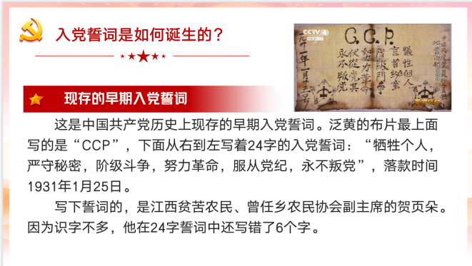 中国共产党诞生初期,在党章中只是对党员入党资格、条件和手续进行了说明。当时,只要承认党的纲领,并有人介绍,经过审查即可入党。入党誓词并不是建党一开始就有的,而是在残酷的革命斗争环境中应运而生的,各个时期的入党誓词也有鲜明的时代背景特点。
