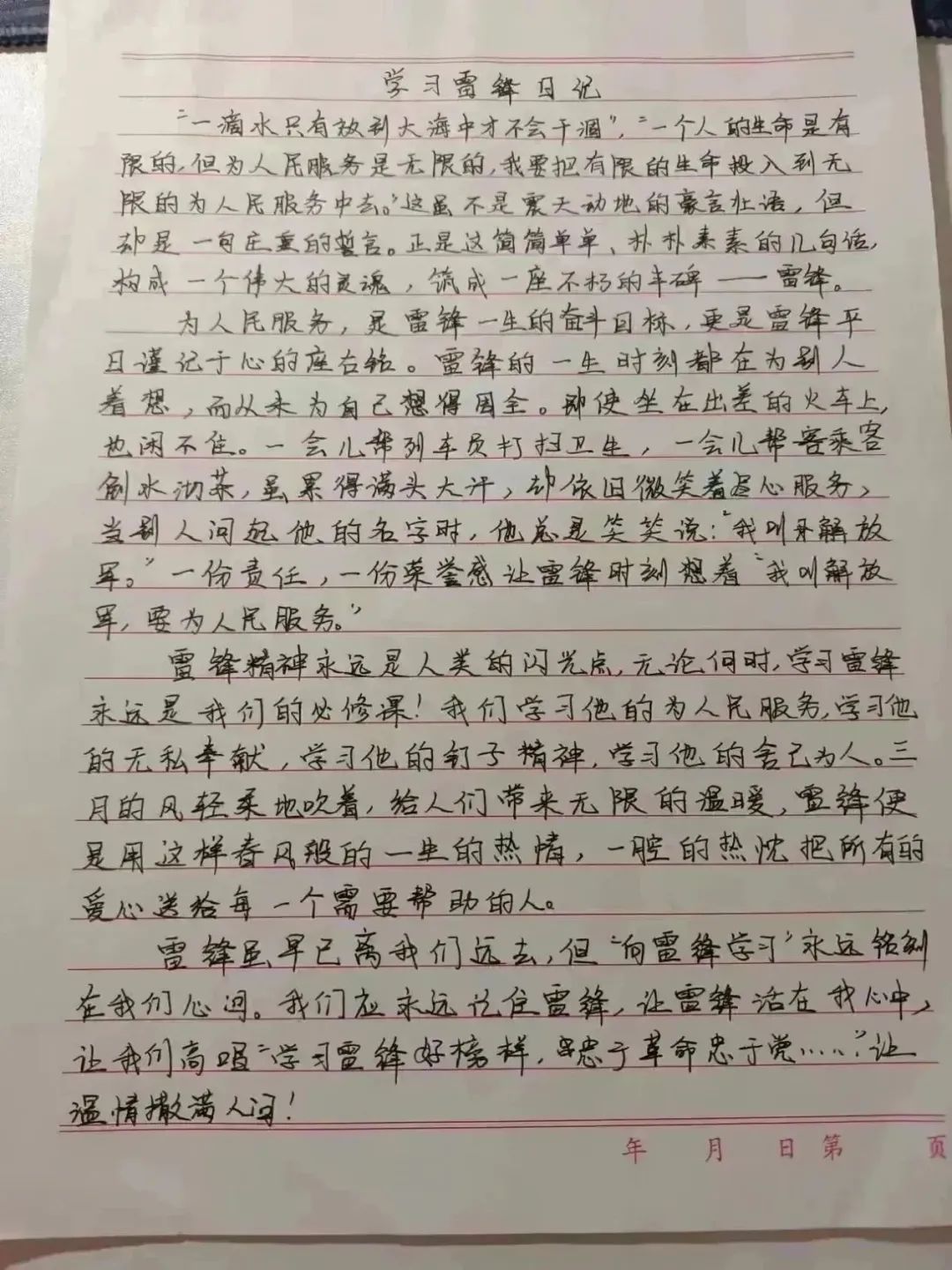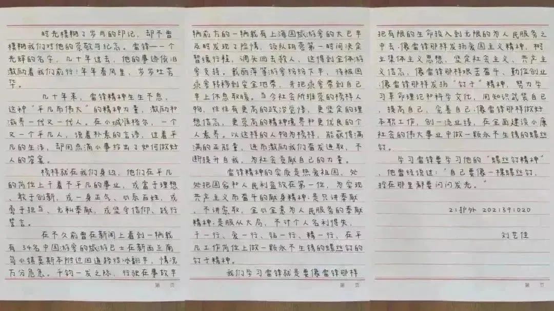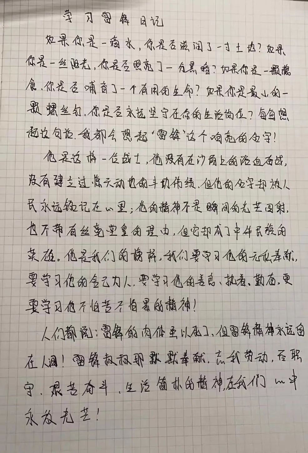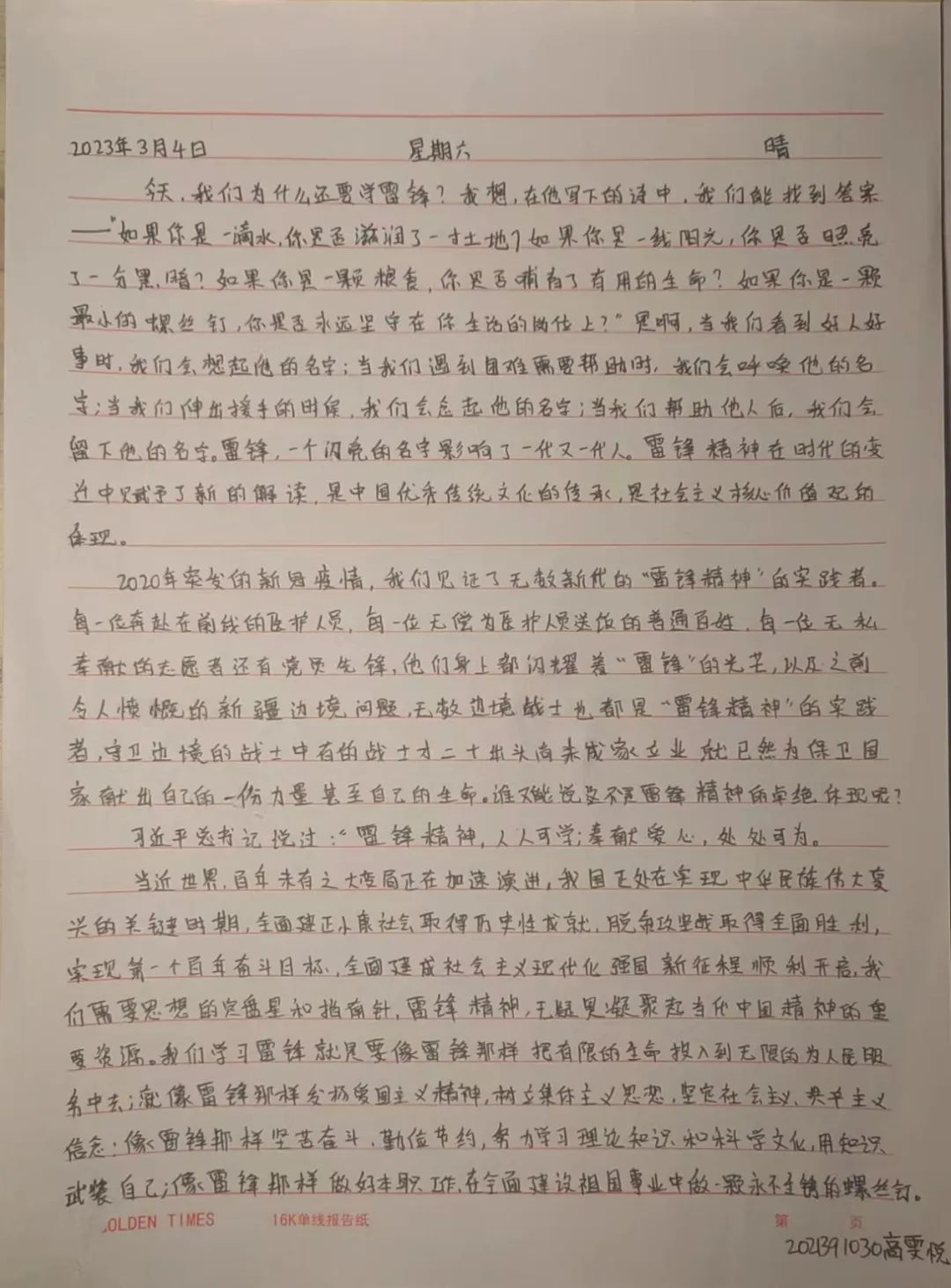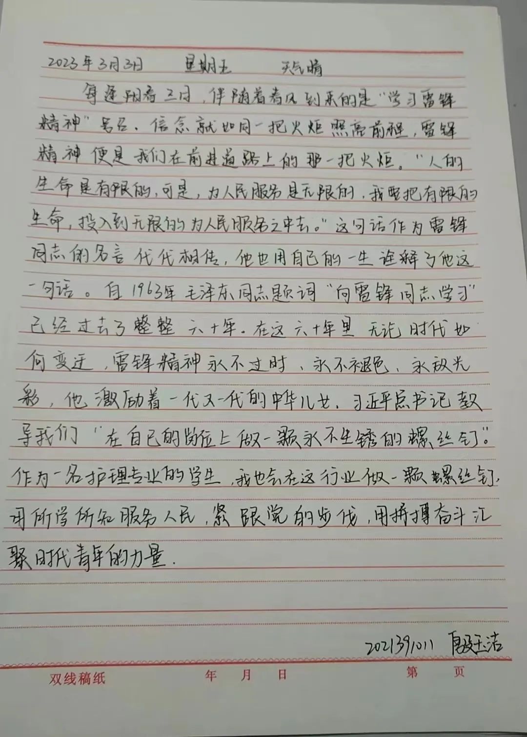 《雷锋日记》作为反映雷锋先进思想的作品,成为了了解雷锋生前的最直接的方式。在班委、入党积极分子的牵头带领下,同学们以第一人称的视角续写自己的“雷锋日记”,通过笔尖进一步感受雷锋的心境的同时更好地学习了雷锋精神的深刻内涵。正如同学们的感悟所说,雷锋精神永远不会因为时间而褪色,反是更加熠熠生辉。新时代的我们更要像一颗螺丝钉一般,在祖国最需要大家的地方闪闪发光。