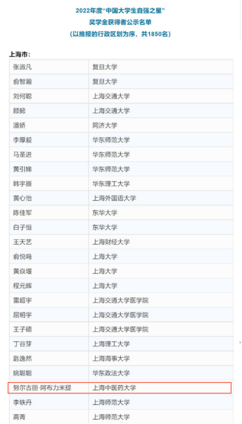2022年度“中国大学生自强之星”奖学金推报活动由共青团中央、全国学联指导,中国青年报社、新东方教育科技集团、中国青年创业就业基金会联合举办。活动以“踔厉奋发 勇毅前行”为主题,旨在树立当代大学生中热爱祖国、品行优良、不畏艰难、自强不息的榜样。自活动开展以来,学校高度重视,积极宣传,营造氛围,大力挖掘优秀典型,经过学校推荐,省级初评,全国评审等环节,最终评审结果公示,我院努尔古丽·阿布力米提同学荣获2022年度“中国大学生自强之星”奖学金。