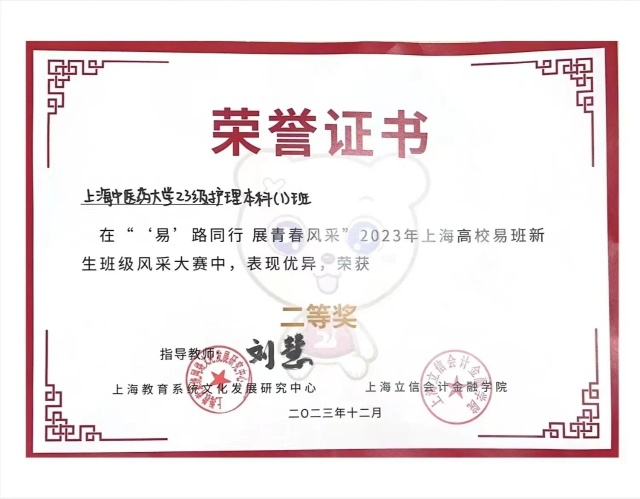 12月10日,由中共上海市教育卫生工作委员会和上海市教育委员会指导,上海市教育系统网络文化发展研究中心、易班网和上海立信会计金融学院共同主办的“‘易’路同行,展青春风采”2023年上海高校易班新生班级风采大赛决赛成功举行。我院2023级护理本科(1)班荣获二等奖。这是继2022年之后,我院连续第二年荣获此项荣誉。