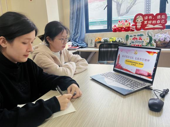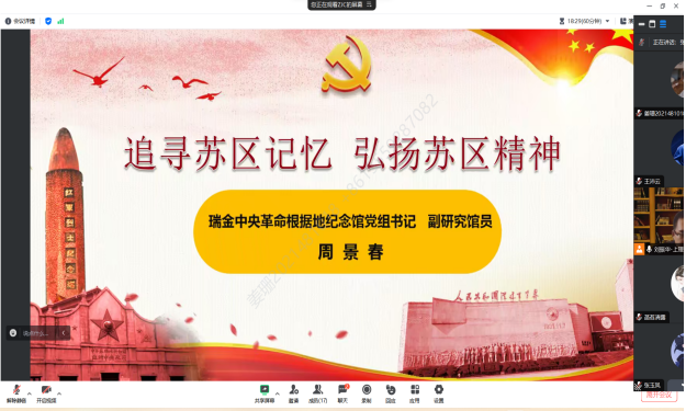习近平总书记指出:“在革命根据地的创建和发展中,在建立红色政权、探索革命道路的实践中,无数革命先辈用鲜血和生命铸就了以坚定信念、求真务实、一心为民、清正廉洁、艰苦奋斗、争创一流、无私奉献等为主要内涵的苏区精神。”为深入了解中央苏区的红军故事,激励支部党员传承红色基因,taptap点点官方网站第二学生党支部的预备党员们一同观看了由瑞金中央革命根据地纪念馆党组书记、副研究馆员周景春主讲的“追寻苏区记忆,弘扬苏区精神”主题线上讲座,深刻领悟与学习苏区的红色革命精神,立志弘扬苏区精神,继承先辈遗志。