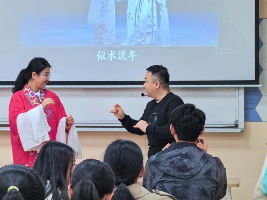 最后,王老师还请同学们穿上戏服,亲身体验戏曲的魅力,指导学员们演绎戏曲《牡丹亭》的经典片段。