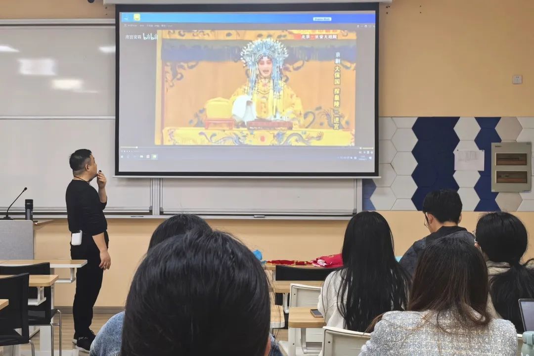 首先,王老师向同学们介绍了戏曲的种类,并以京剧《大保国 探皇陵 二进宫》为例,赏析了戏曲演员的技巧水平、文化修养以及表现力,使同学们体会到统一剧目中不同唱腔的无限魅力,课堂上弥漫着梨园春色。