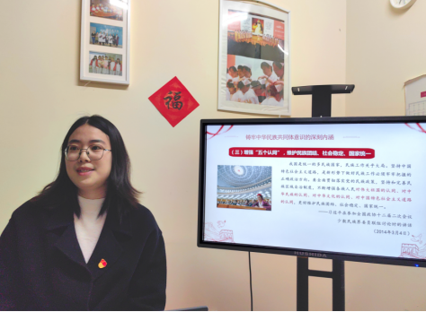 活动伊始,吉晨睿老师以“石榴籽精神”引入,指出铸牢中华民族共同体意识是维护民族团结的思想基础,“四个共同”是中华民族共同体之所以“共同”的历史根基。紧接着,她结合习近平总书记的系列重要讲话,梳理了“铸牢中华民族共同体意识”理论发展的历史脉络,并从三个方面阐释了铸牢中华民族共同体意识的深刻内涵,引导同学们深刻认识到这一重大论断是马克思主义民族理论中国化的最新成果。吉老师结合今年央视春晚新疆喀什分会场为例,进一步阐述了文化交流与融合的积极影响。通过学习,同学们逐步领悟到铸牢中华民族共同体意识的重要意义,更加坚定“五个认同”、牢固树立“四个与共”的共同体理念。