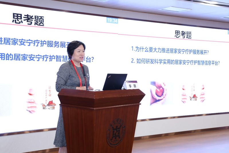 李丽主任介绍了居家安宁疗护服务模式下智慧平台研发项目。上海市居家安宁疗护服务需求巨大但供给不足,尚未建立居家安宁疗护服务信息系统,李丽教授带领团队构建了居家安宁疗护智慧服务模式(掌上嘉医),并形成“海医大三院-嘉定”安宁疗护联合体,推进三级医疗机构区域学科引领作用。