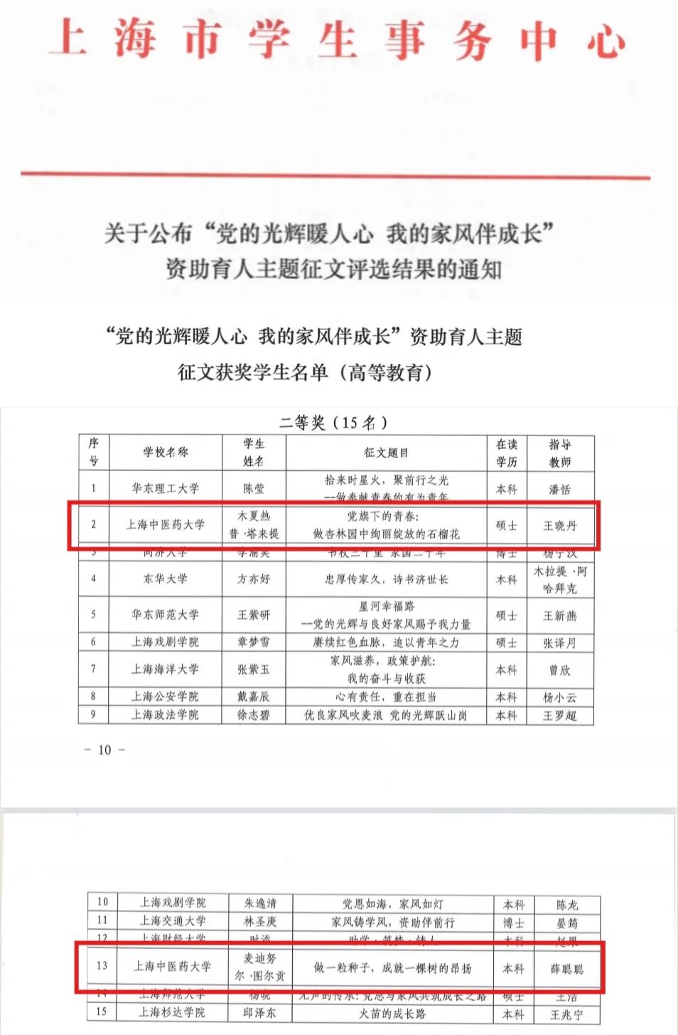 近日,由上海市学生事务中心发文公布“党的光辉暖人心 我的家风伴成长”资助育人主题征文评选结果。taptap点点官方网站《党旗下的青春:做杏林园中绚丽绽放的石榴花》(作者:木夏热普·塔来提,指导教师:王晓丹)《做一粒种子,成就一棵树的昂扬》(麦迪努尔·图尔贡,指导教师:薛聪聪)双双荣获了二等奖。