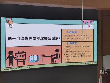 随后,学院邀请2021级护理学本科生姜珊和2023级护理学中本贯通学生吴乐阳先后分享选课经验。姜珊学姐结合自身经历从“选课前准备”“选课流程”“选课后注意事项”三方面讲述如何发挥选课自主权。她提醒大家应注意选课时间,也应做好选课的备选方案。吴乐阳学姐以理论和实操的方式,生动讲述了选课的具体流程,她强调需要关注课容量以及选课批次,确保无漏选错选。