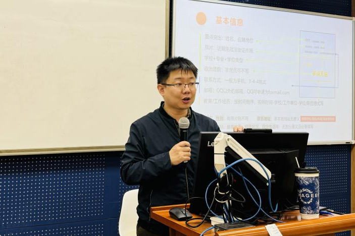 制作简历主要包括三步。第一步明确个人信息;第二步提取该岗位的关键性、隐性及筛选性需求;第三步进入制作简历。何逸潇老师表示,简历中的基本信息应准确且有意义。实践经历的描述需遵循STAR原则(Situation、Task、Action、Result),需根据岗位需求针对性书写,做到“言之有‘据’,描之有‘数’”。在陈述核心优势时,需从真实经历出发,忌空话与套话。简历不仅要有内容,还应追求美观,何逸潇老师强调了简历中的字体、字号、色彩等具体要求以提高简历观赏性。其还强调,在求职的过程中需关注各项政策,避免无效求职。提及面试技巧,何逸潇老师通过自身面试经历表示,同学们可多投简历,多参加面试以锻炼个人心态与熟练度。