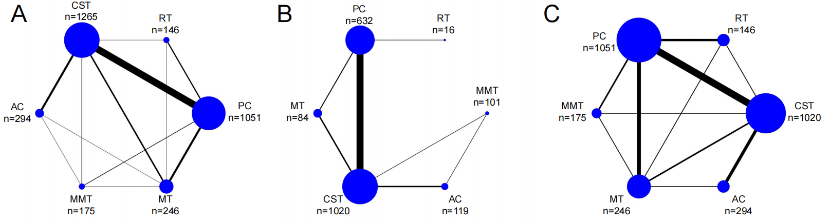 注:(A)整体认知,(B)主观认知下降和轻度认知障碍;(C)痴呆。CST:认知策略训练;RT:回忆疗法;MMT:正念冥想疗法;MT:改良疗法;PC:被动控制AC:主动控制;n:患者总数。