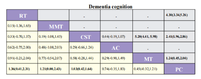 研究取得了关键性发现:怀旧疗法在改善所有认知障碍患者的整体认知功能方面最优。同时,认知策略训练在改善语言功能、即刻记忆、缓解抑郁症状及提升生活质量方面优势显著。研究还证实,认知训练对整体认知功能的改善效果在不同痴呆程度、干预形式(个体/小组/基于互联网/面对面)、干预者专业水平、训练时长和对照类型等条件下均能保持稳定。