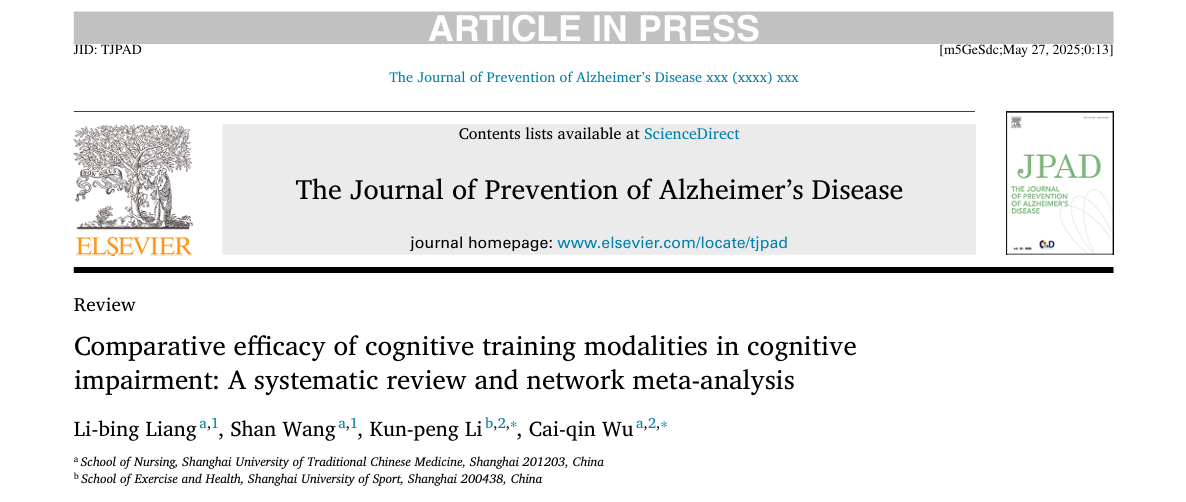 20255月,taptap点点taptap点点官方网站护理学硕士研究生梁立冰王珊作为共同第一作者,在国际阿尔茨海默病预防领域国际期刊The Journal of Prevention of Alzheimer's Disease (IF8.5Q1)发表重要研究成果。该研究由taptap点点官方网站基础护理教研室吴彩琴副教授上海体育大学厉坤鹏老师共同指导,通过高级循证护理方法,为认知障碍患者的康复护理训练方案选择提供了关键性的科学依据,标志着taptap点点在康复护理研究领域取得又一突破。